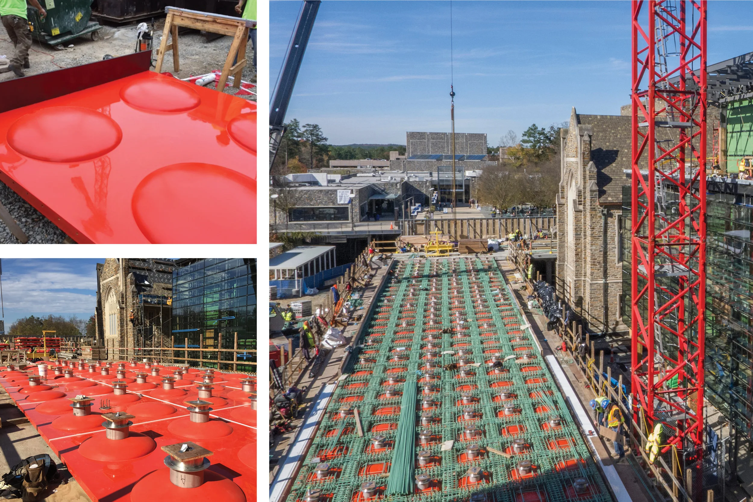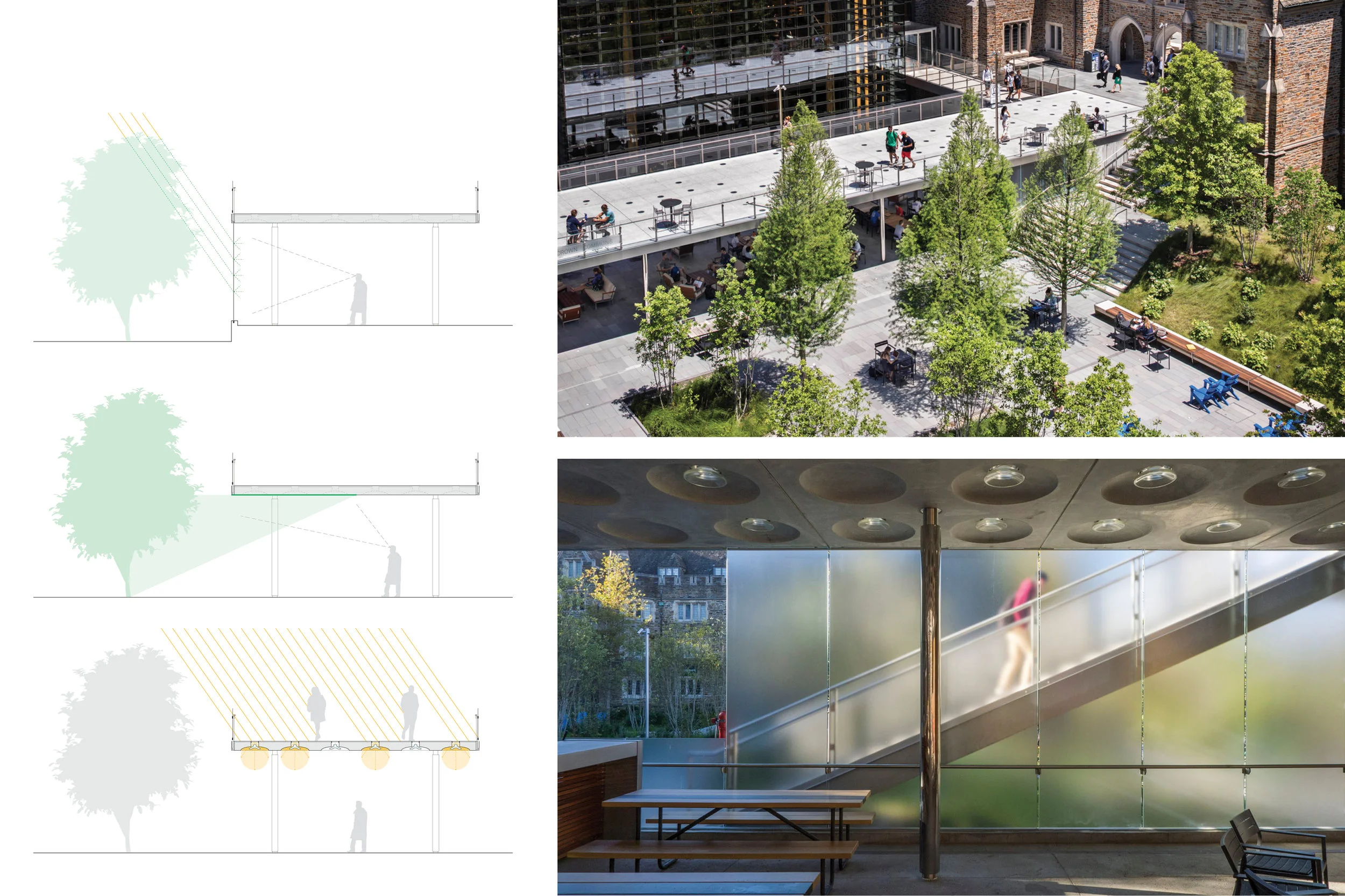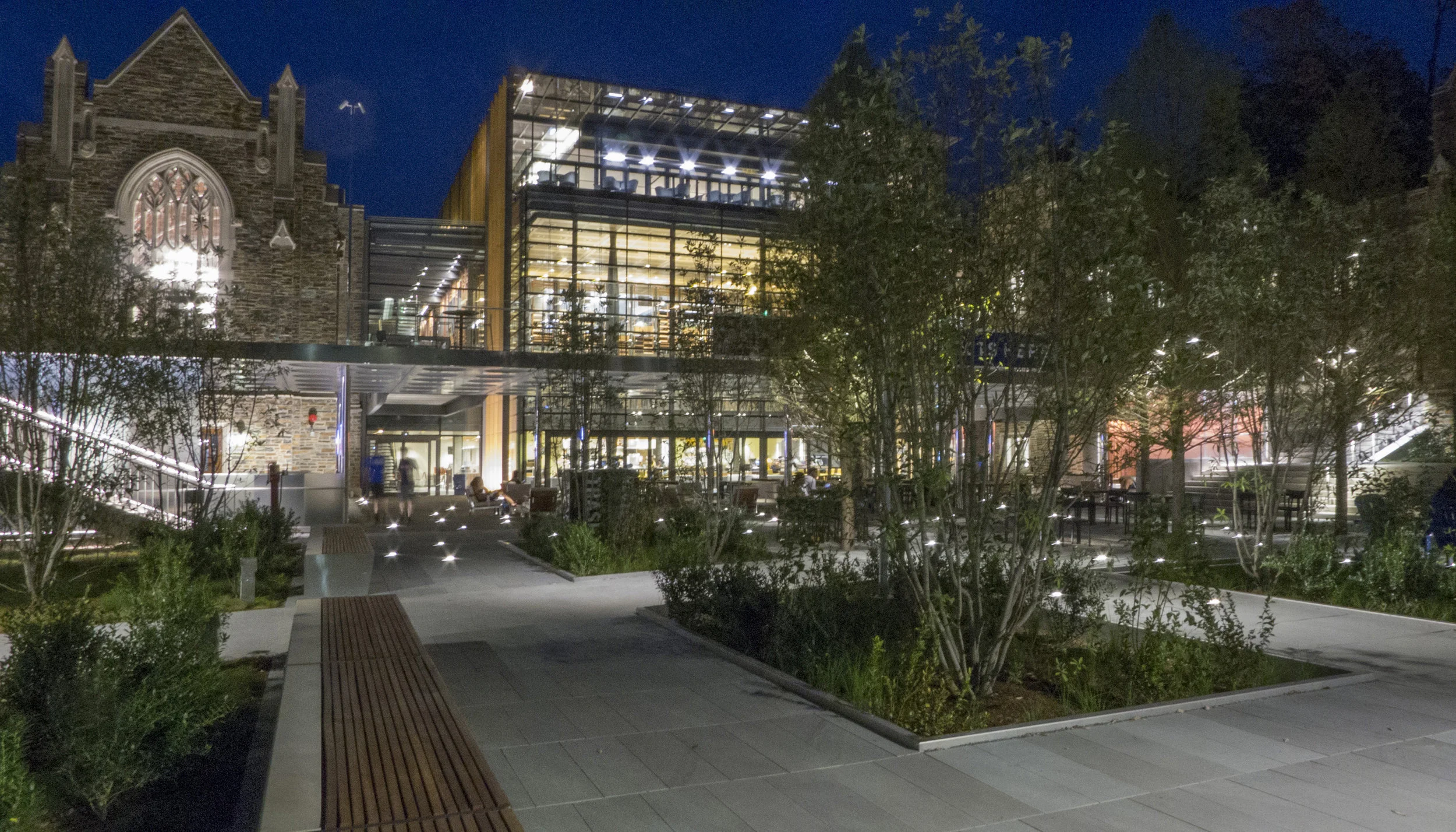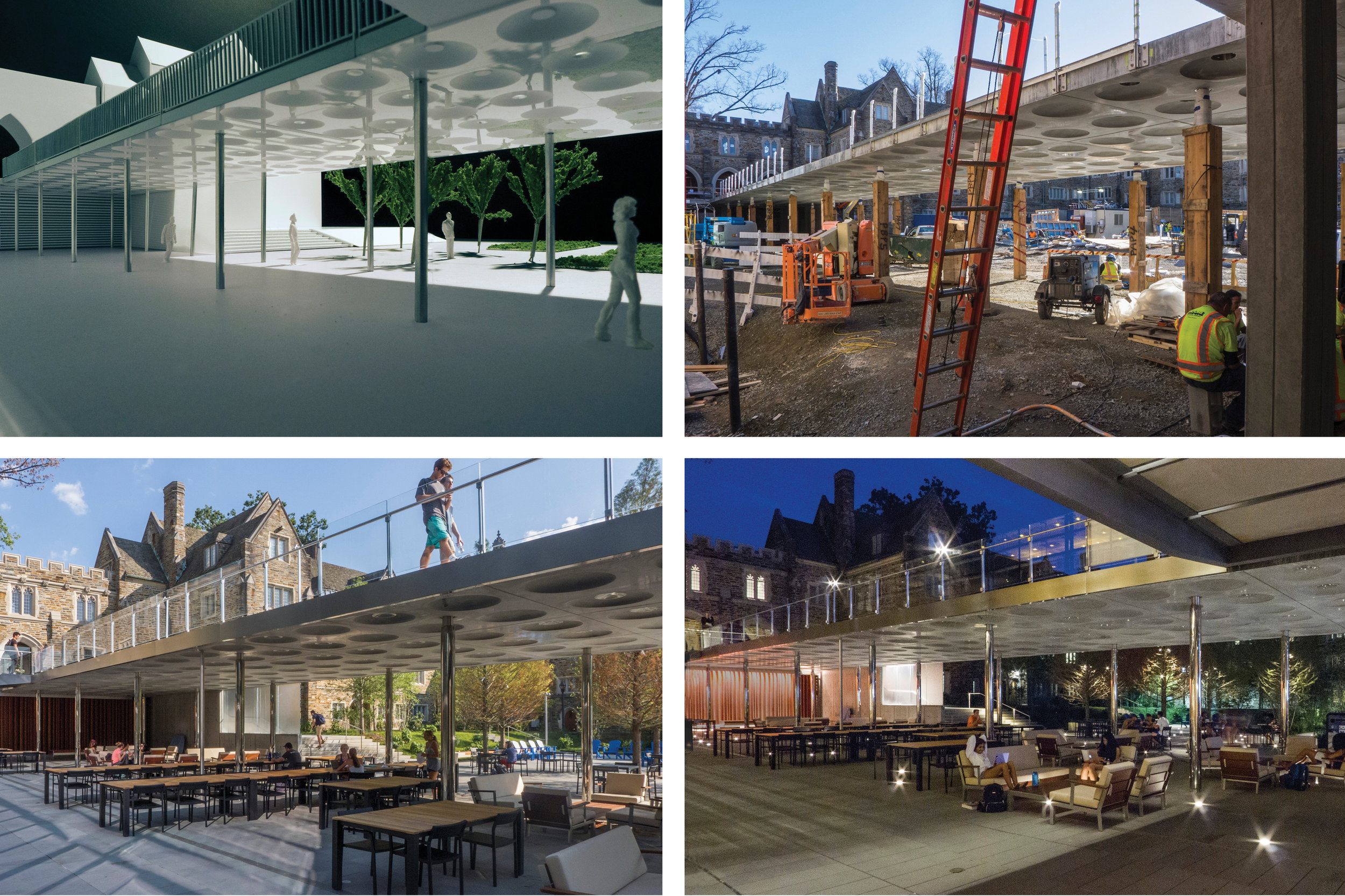 Situated in the heart of Duke’s Campus, the Bridge Pavilion is both the primary piece of circulation infrastructure in the West Union District of the Durham campus and a shaded outdoor pavilion for social gathering, study, and dining. The Bridge Pavilion is an informal social and cultural node for students and faculty. The coffered concrete roof serves as a physical bridge for students passing through the West District and provides access to the new West Union Broadhead Center. Cast glass lenses embedded in the concrete bridge deck bring daylight to the spaces below and display the pulse and activity of student circulation waves throughout the day.