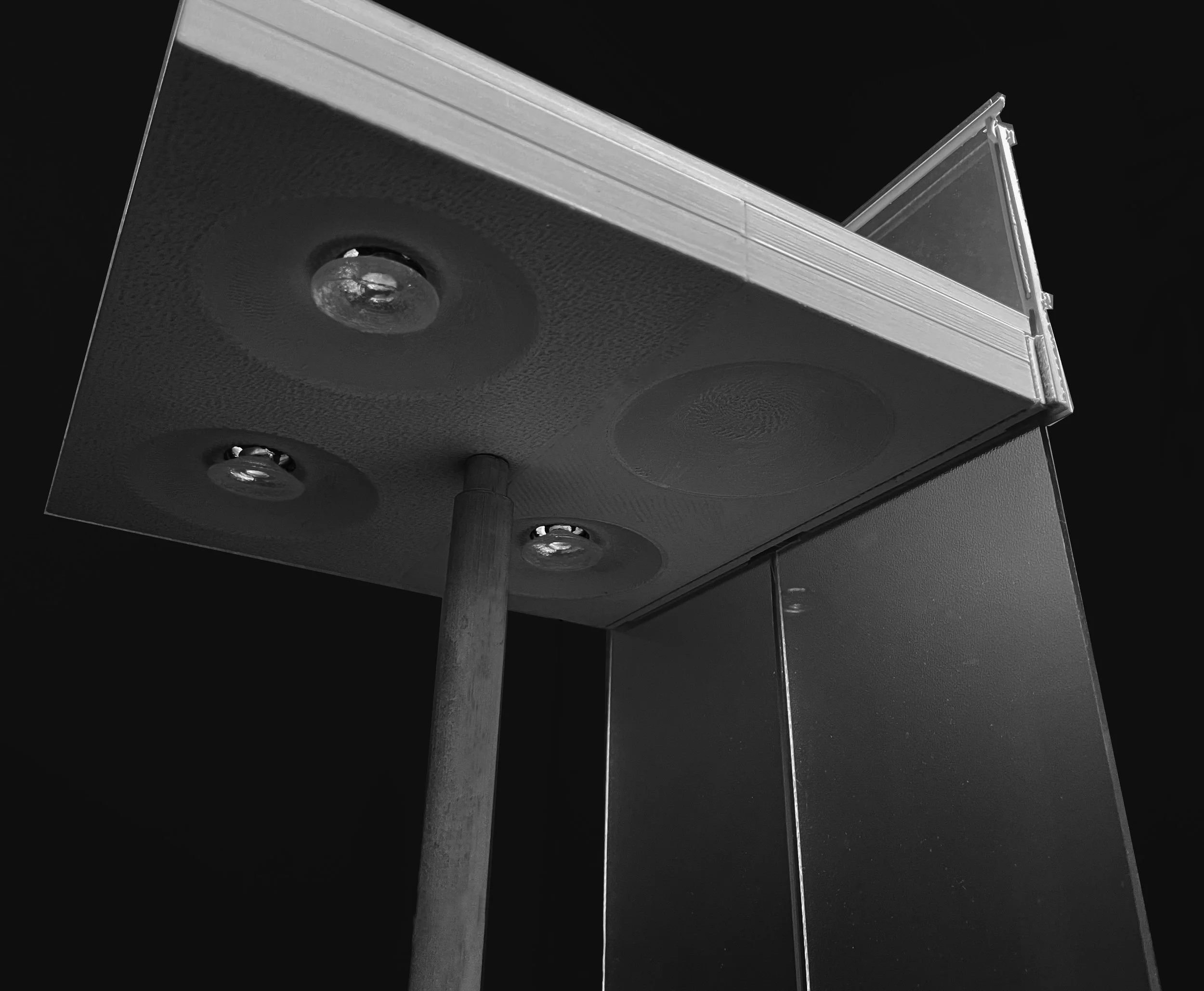 The thin concrete structure is supported with slender mirrored stainless steel columns and one shear wall. The underside of the bridge acts as the pavilion ceiling with coffers that remove mass and add structural efficiency. The ceiling visually references the waffle slab and skylight system of the nearby Bryan Center, a student services building at the terminus of the bridge’s axis.