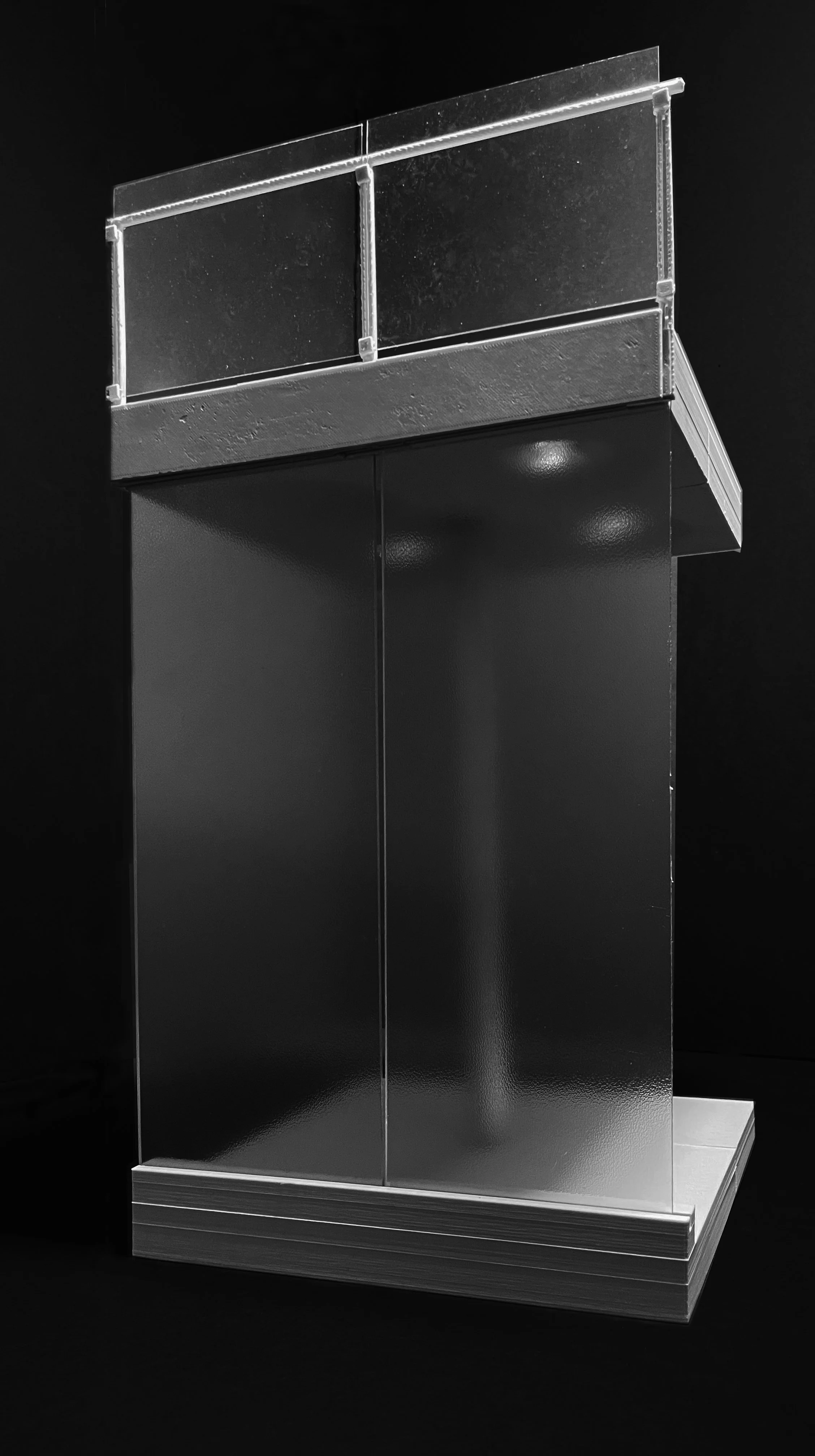 In the pavilion, the reflective surface of the structural concrete slab soffit is achieved using custom formwork. The mirror finish of the polished stainless steel columns captures color, light, and views of the adjacent landscape of Crown Commons and the changes of light and color throughout the days. Strategic vertical planes of etched glass subtly define rooms and enclosure while maintaining an accessible and welcoming atmosphere. The etched glass walls moderate the outdoor conditions and collect, abstract, and display light and color from the adjacent landscape.