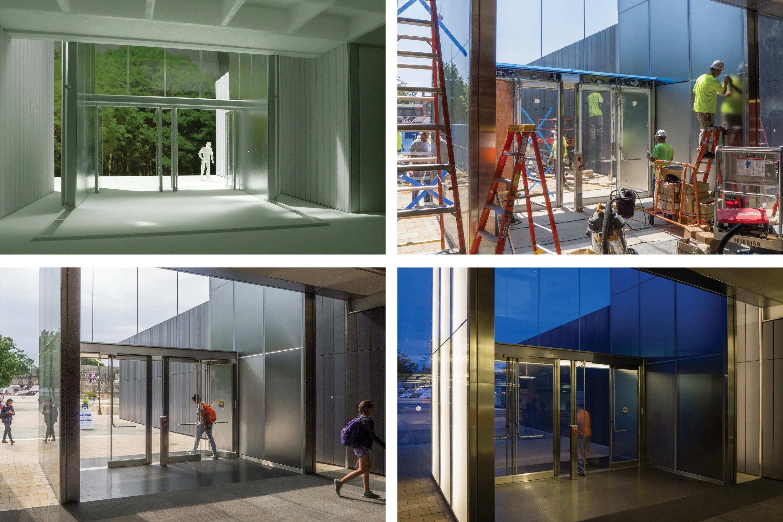 Daylight and transparency are prioritized to clarify and organize the interior and exterior public circulation spaces. The Sidewalls of etched glass and diffused reflective metal of the Bryan Center Entries create atmospheric and dynamic reflections of the surrounding natural environment and help blur the threshold between the natural exterior landscape and the built interior environments. The entry volume frame was preassembled at the fabricators shop, parts numbered, and then disassembled for shipping from Germany. This allowed for quick assembly in the field to meet the client’s ambitious schedule. The project was allowed a short window for construction in the summer between the academic semesters to minimize disruption to the operations at the student center. The Bryan Center is the heart of undergraduate life on the West Campus. It houses the campus bookstore, the mailroom, retail dining, and all student clubs/organizations.