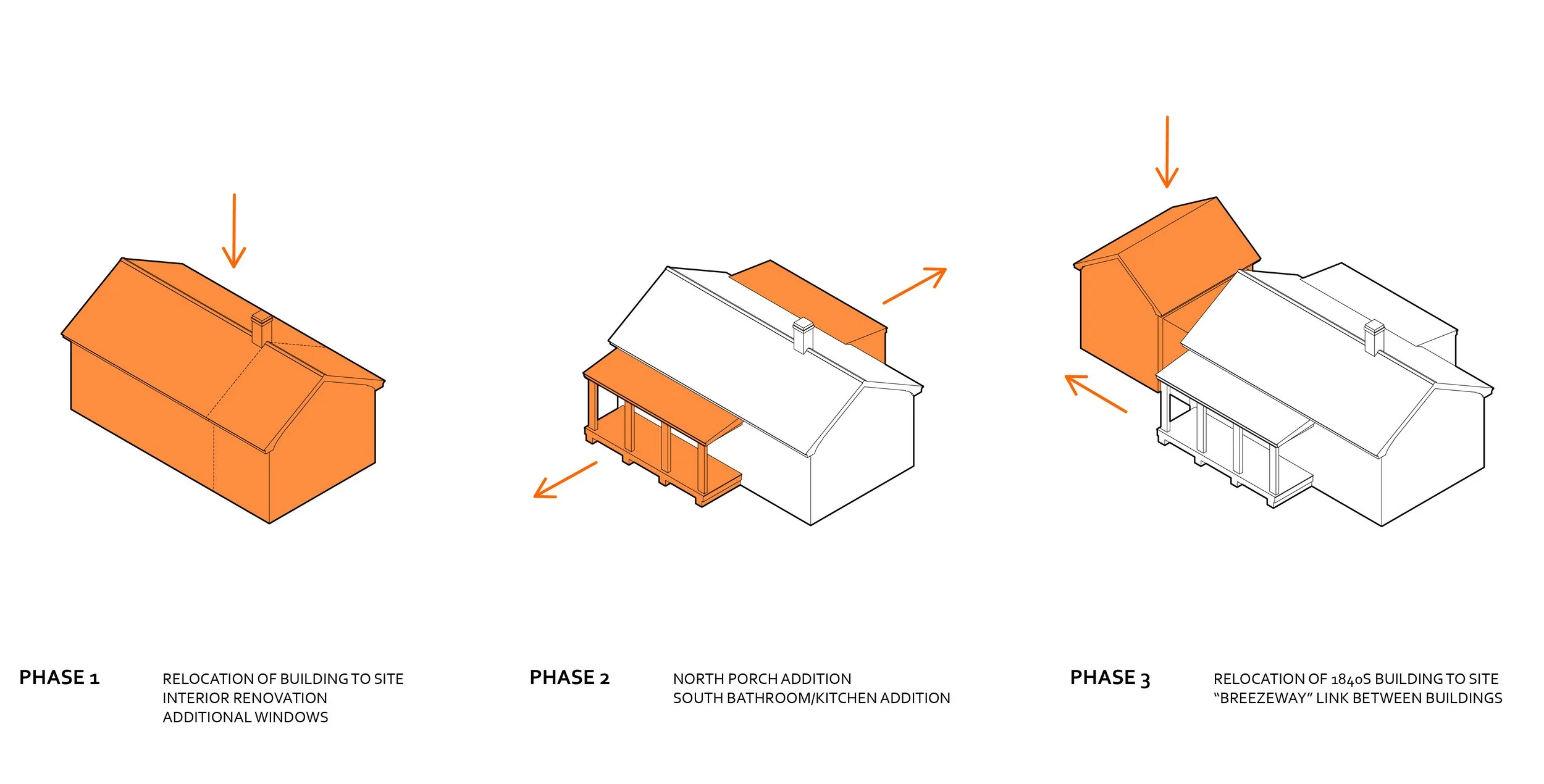 An experienced house mover assisted the architects with relocation of the two structures. The project was phased over an extended period to allow for continued use of the cottage throughout the construction.