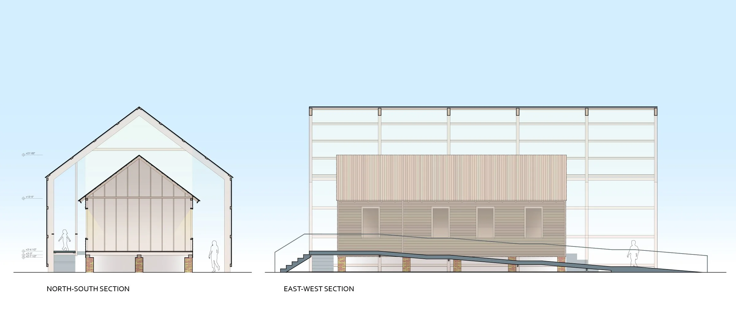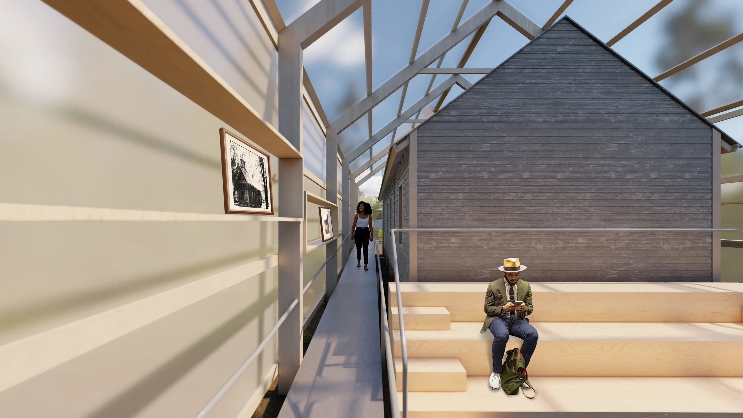 The Lake Hall School Pavilion is a pro bono project for a non-profit group focused on saving and preserving a remaining wood framed reconstruction era schoolhouse building in northern Florida. Concept work was done by REID architecture PLLC to provide the non-profit with visual materials and a program concept for grant and funding applications. Once funds are secured to purchase the building and land, the project will be phased to allow for the erection of a diffused over-structure to protect the schoolhouse before and as it is rehabilitated. An elevated walkway positioned between the historic building and the new structure allows visitors to view the restoration work in progress, see historic artifacts associated with the schoolhouse buildings rich history, and hear audio of local inhabitants recorded stories establishing the importance of the Lake Hall School to the region and community.