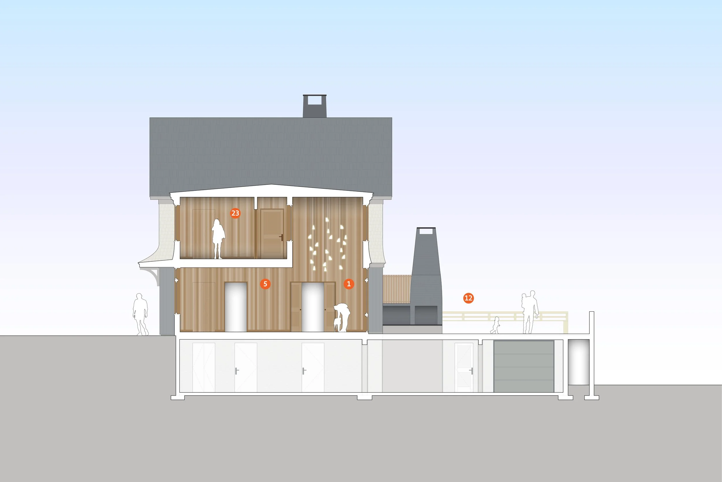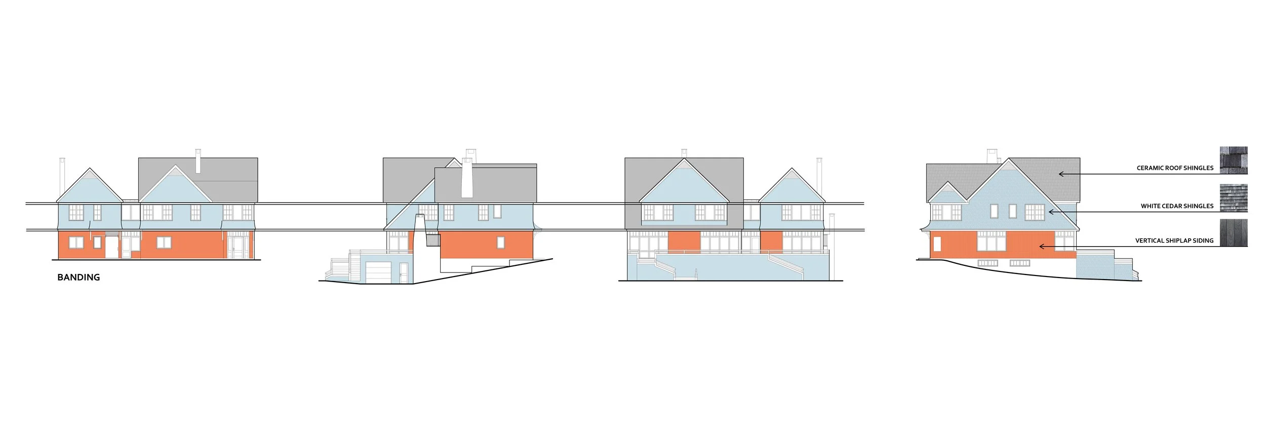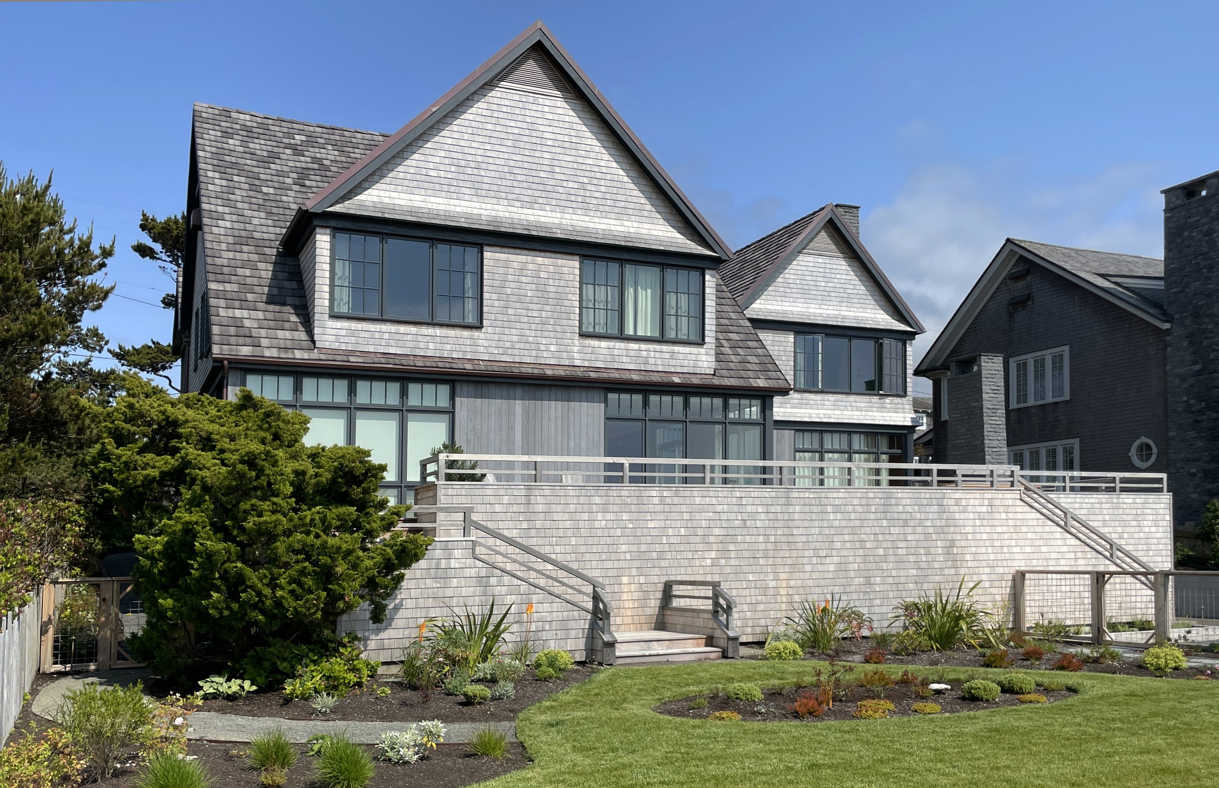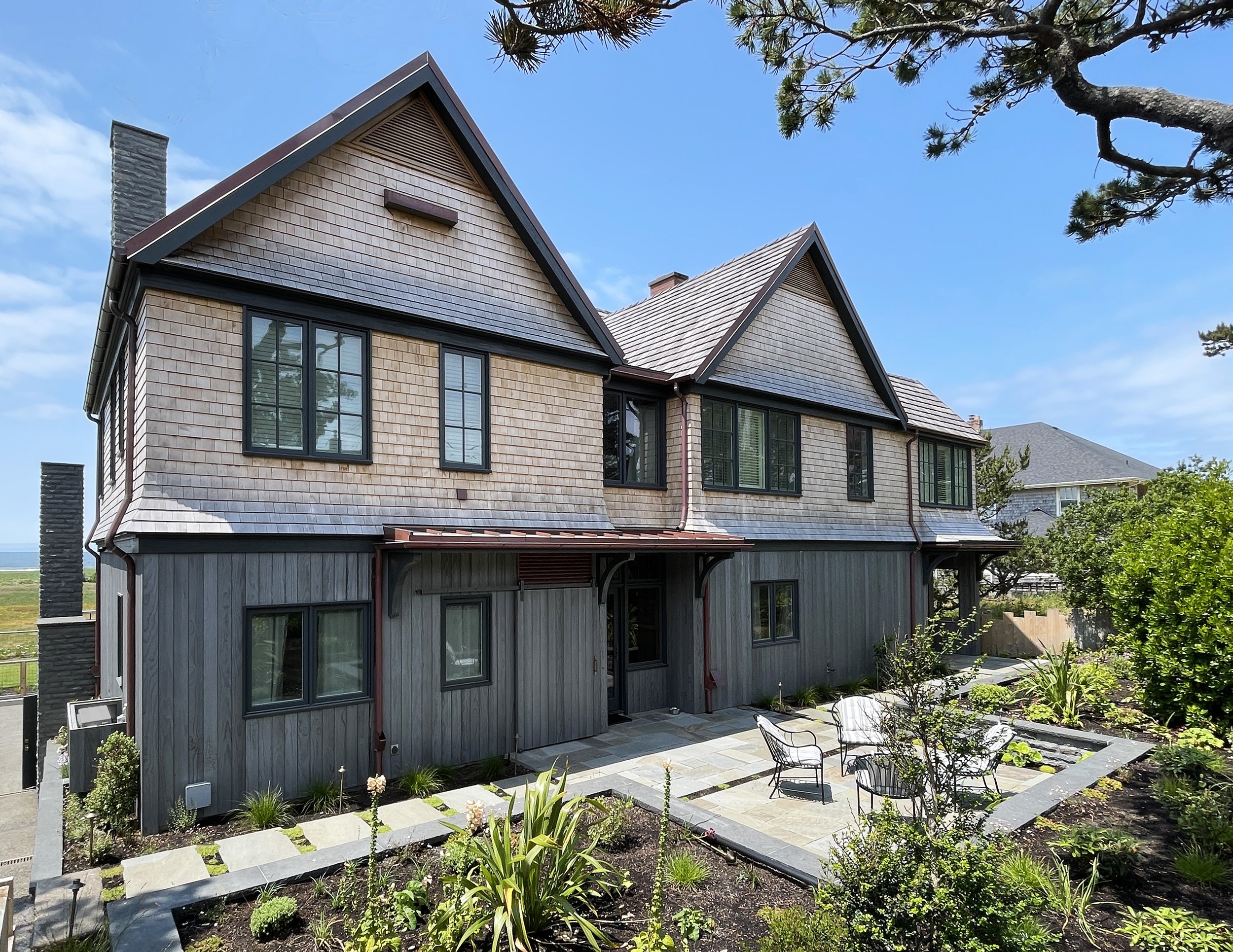 The project started as a window replacement for a 1920s shingle style house in small Oregon coastal town. After the architect and clients spent a weekend together in house the project was expanded into to a full house renovation and addition. The prime goal of the project was to strip away layers of materials accumulated over years by different owners and return the house back to its original palette of local materials. The floor plans were reorganized for a more equal distribution of bedroom spaces for family members and to create living spaces with different views and characteristics. A new wing was added to south to provide a new family room, a primary bedroom suite, and an elevator for convenience. A large dormer was added to the west elevation roof to provide more space for guestrooms and an expanded deck was added over a new enclosed garage at the southwest corner.
