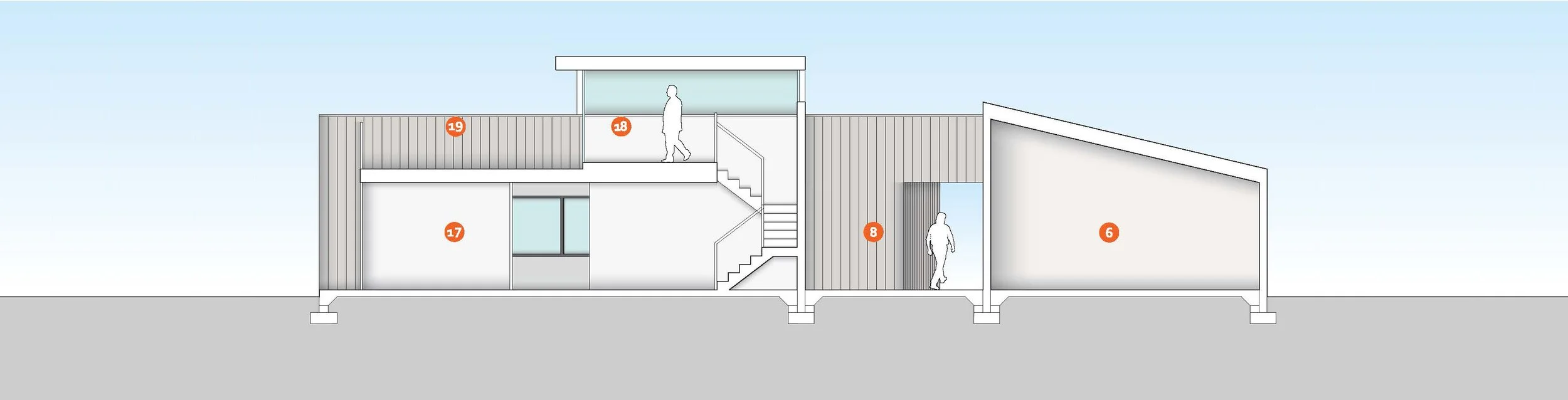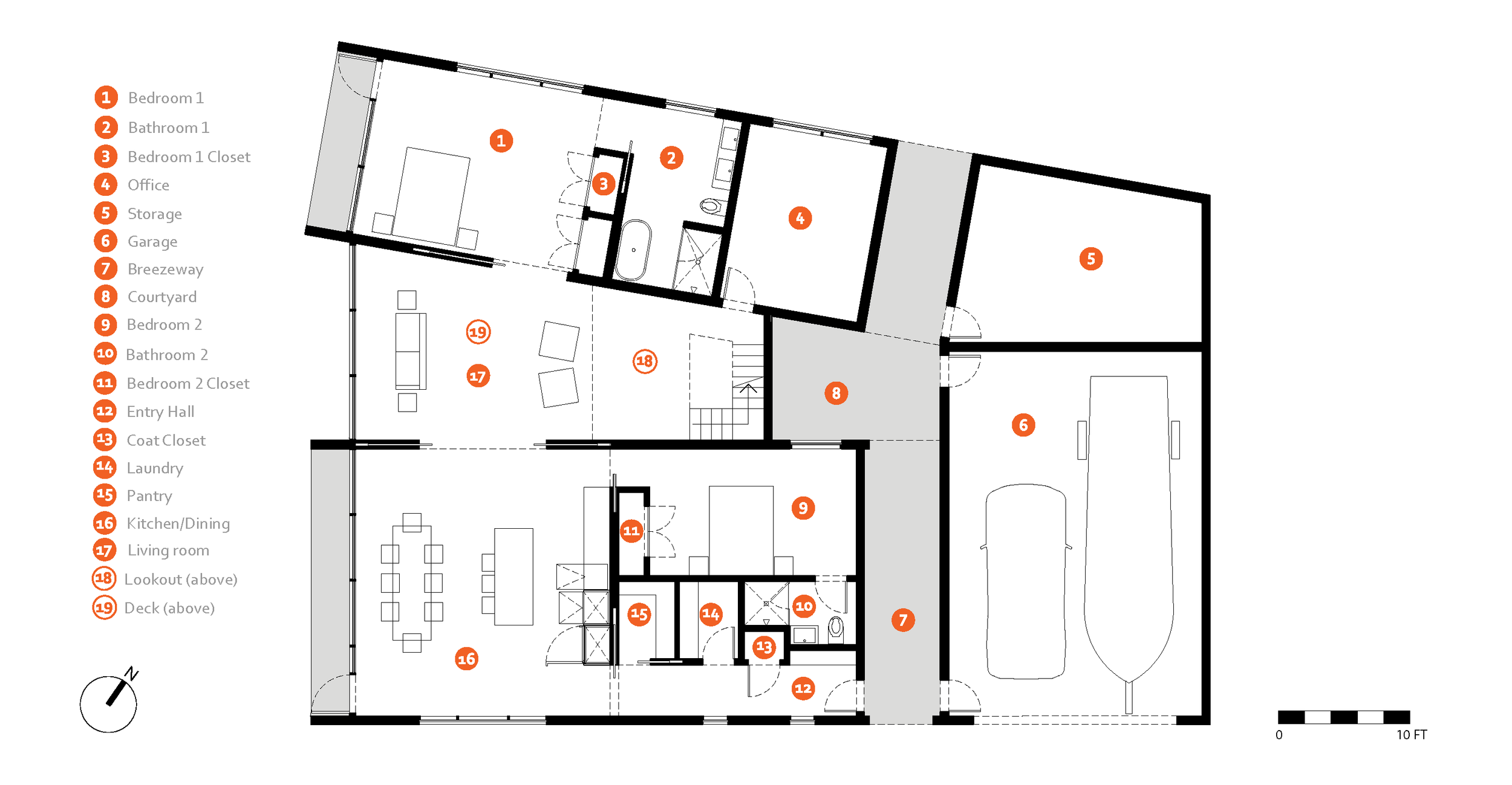The house programs are organized into two main bars with a deep garage at the rear for boat storage. The two main bars have long views of the river to the south. The living room is situated in an area between the bars with a lookout room and an exterior deck above. The roof form and its folds reduce the building height at the perimeter and maximize height at the south end in order to frame the views of the water. A small courtyard space in the center of the house provides daylight and cross ventilation for the public spaces, a guest bedroom, as well as a home office.