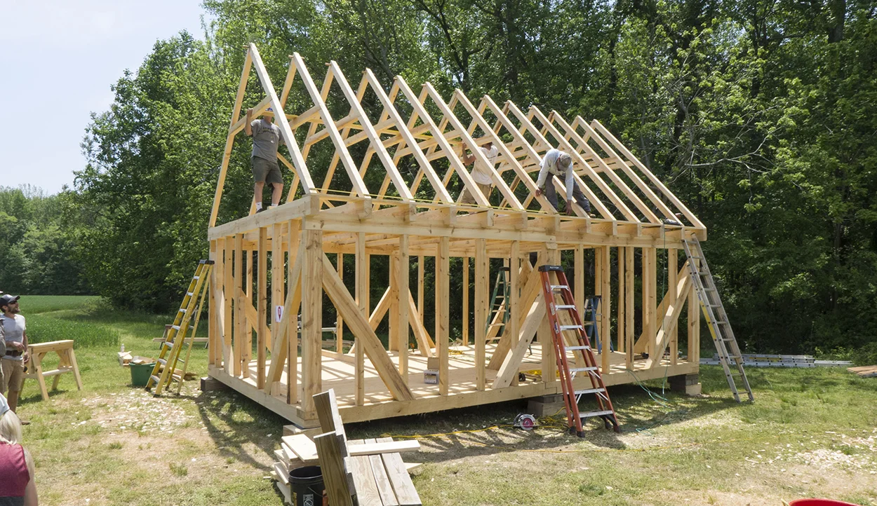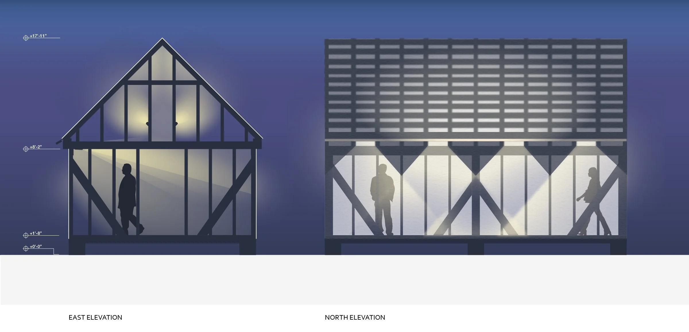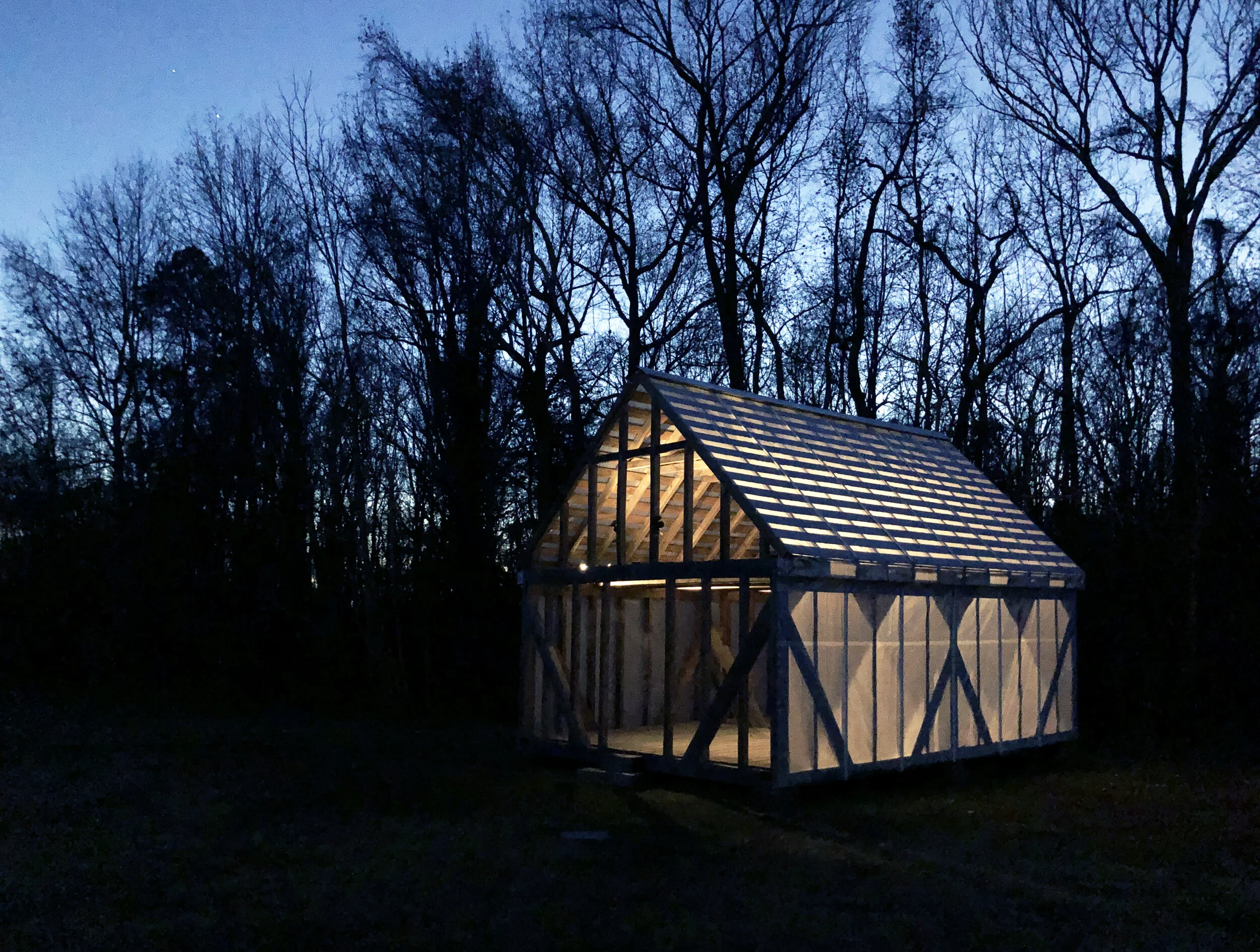 The framing of the Remembrance Structure is left exposed and wrapped in a translucent building fabric to reveal its construction details as an educational component of the structure. The membrane protects the wood framing from the elements and provides comfortable daylight levels to the interior. At night, solar powered interior flood lamps highlight the structure’s tectonics and the structure serves as a luminous memorial to the site’s forgotten history and inhabitants. Transparency and luminosity are concepts linked to the foundation’s mission statement. The pavilion was constructed on site using local materials during a five day building workshop by a team of craftsmen, students, and volunteers and embodies the Menokin Foundation’s goal of promoting education in the building arts.