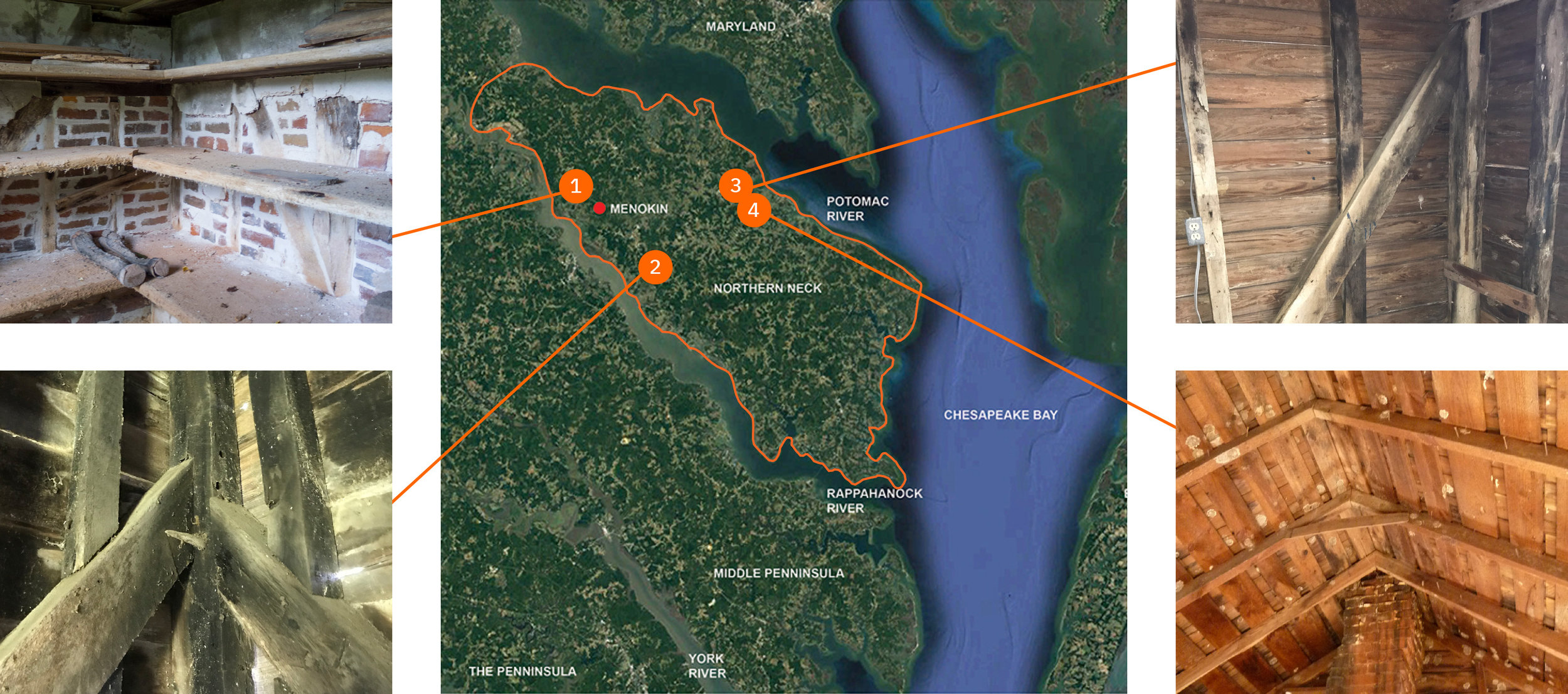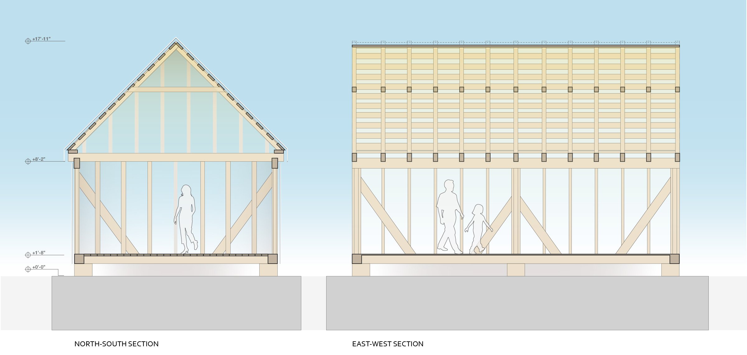 The Remembrance Structure’s design stems from research of the few remaining 18th century timber structures in the isolated Northern Neck Region. The structure’s proportions and details are physical demonstrations of the region’s vernacular construction techniques gathered through surveys of remaining 18th and 19th century structures. Its overall footprint, 15.5’ x 25,’ is based on archaeological records of a former dwelling.