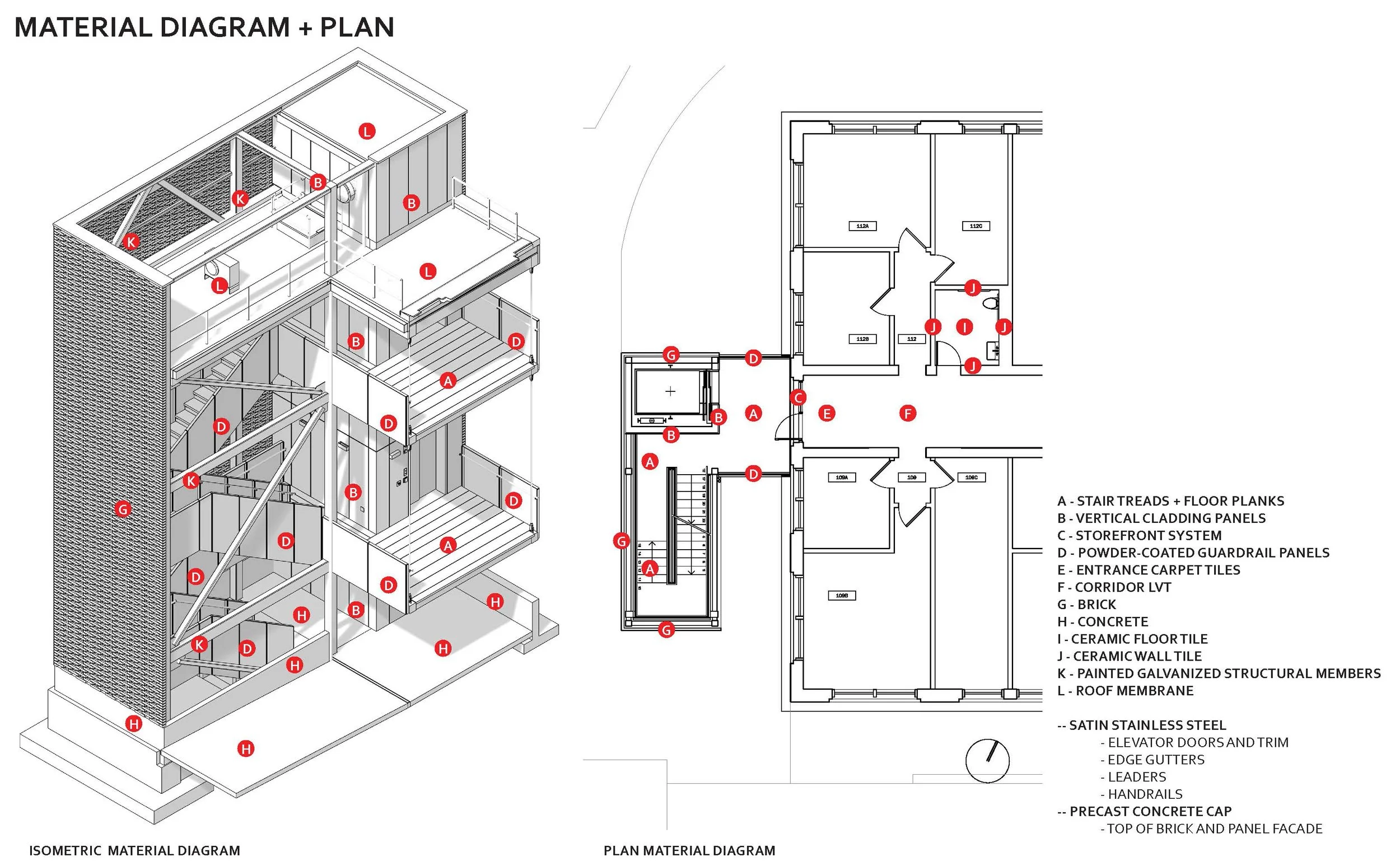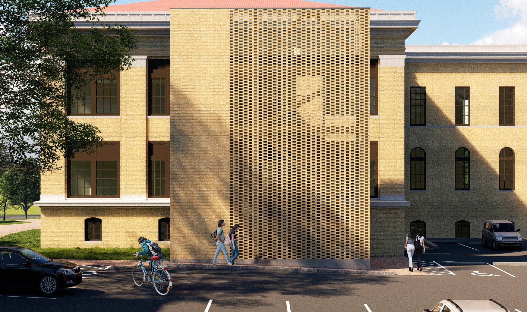 An open brick screen wraps the small tower on the north, west, and south elevations harmonizes with the existing masonry, provides solar shading and some privacy to the outdoor stair and lobbies, and relates to a historical masonry precedent on the Chapel Hill campus.
