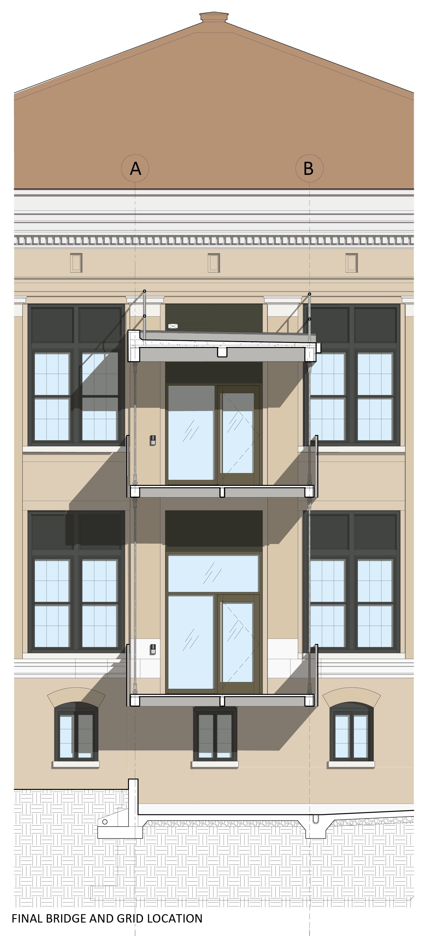 The new circulation tower is set off from the building’s existing facade to minimize the impacts on historic building fabric and foundations. The new addition’s horizontal circulation connects to Caldwell Halls’ main east / west corridor through a cantilevered bridge which also serves as an area of refuge for the new accessible means of egress. The grade level entry and outdoor lobby is connect by a new walkway to existing campus circulation.